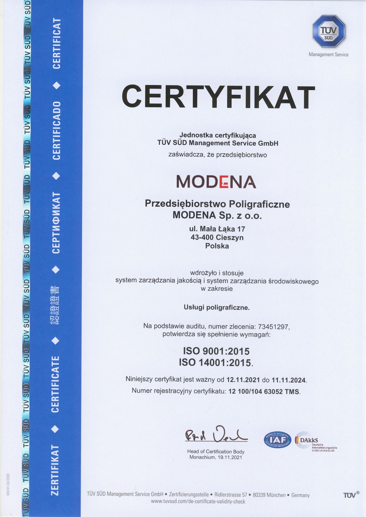 Nasza drukarnia posiada certyfikaty ISO 9001 oraz ISO 14001, które potwierdzają najwyższe standardy działania zarówno w zakresie jakości usług, jak i dbałości o środowisko.